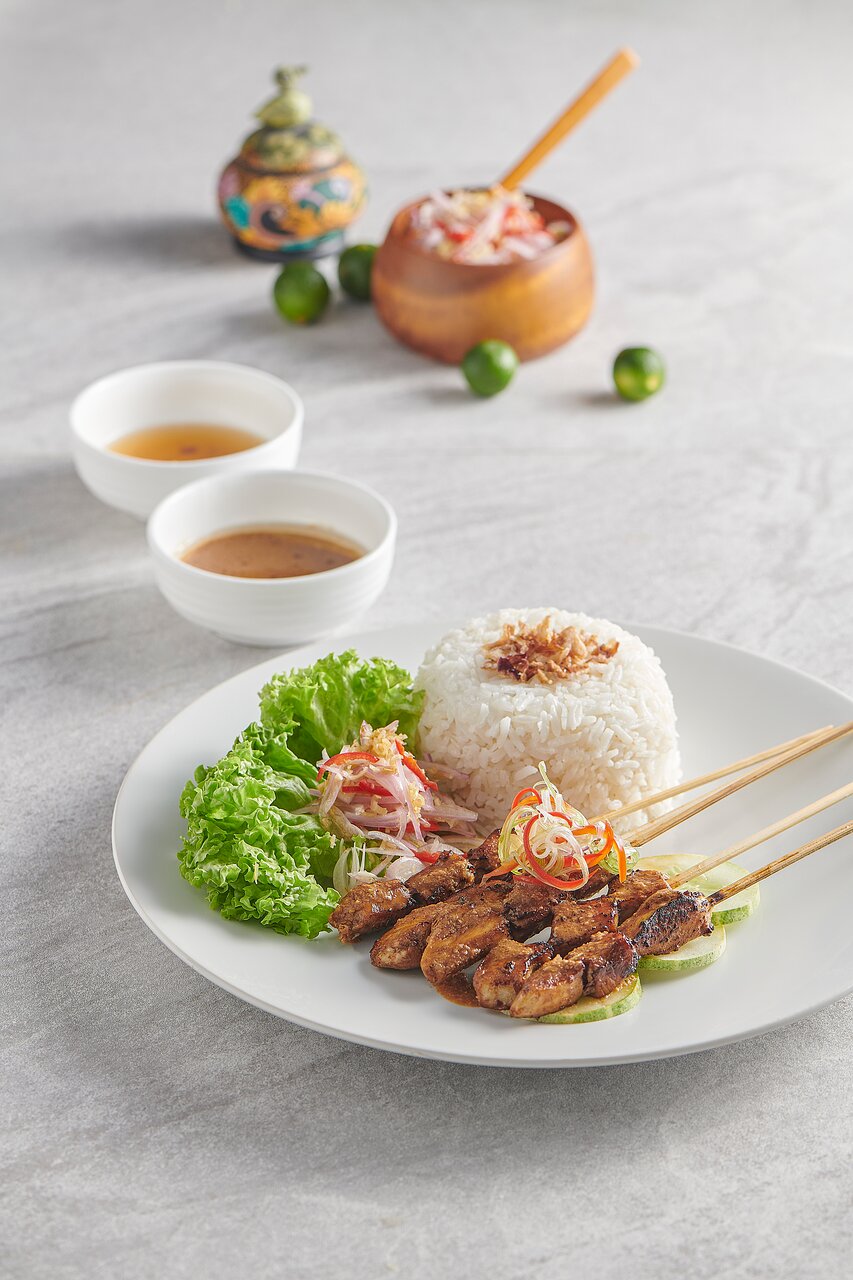 Enjoy our Balinese Chicken Satay, perfectly grilled with a blend of aromatic spices and served with a creamy peanut sauce for a rich, savory flavor.